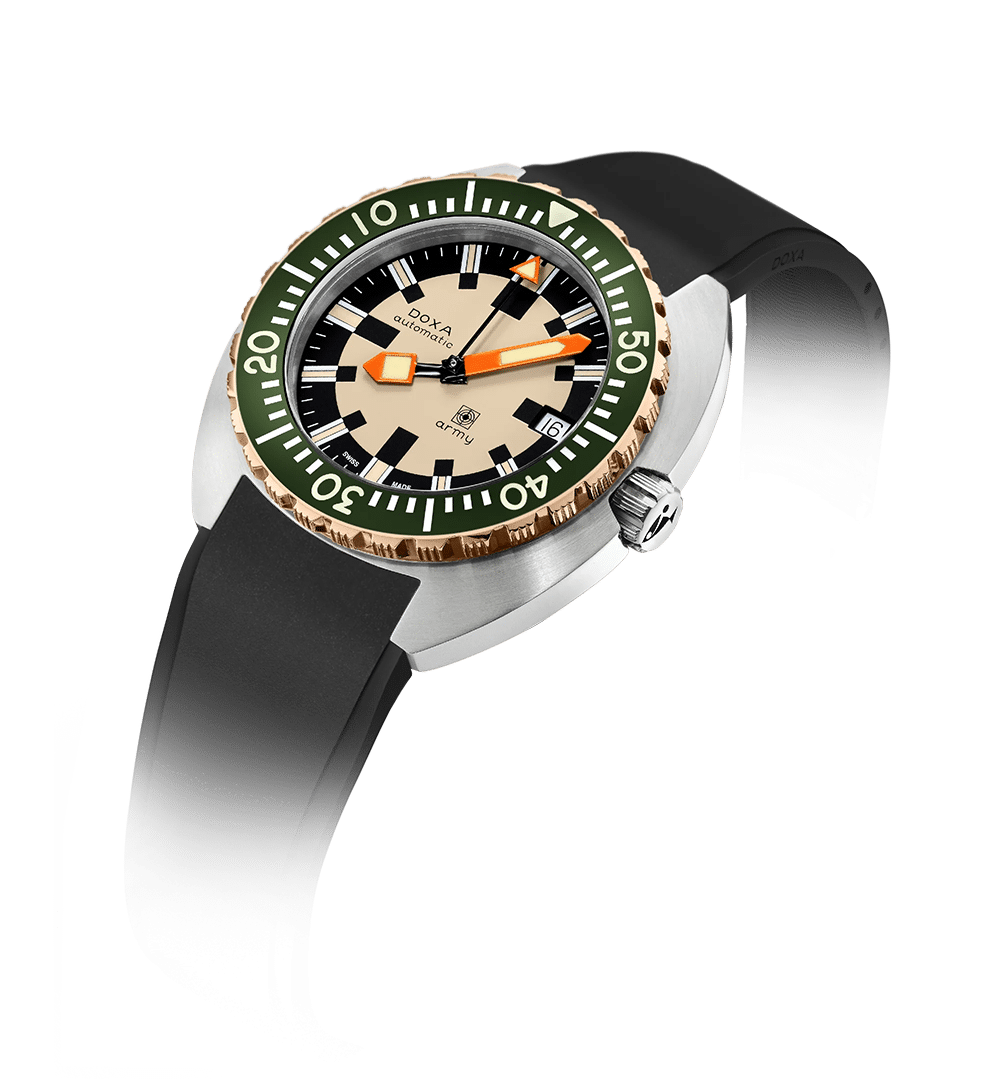 Den nye DOXA Army kombinerer trofast gjenskaping av originaldesignet med moderne teknologi og robusthet tilpasset dagens krav. Urkassen på 42,5 mm i 316L rustfritt stål er utstyrt med ripebestandig safirglass og tåler trykk opp til 30 ATM (300 meter).