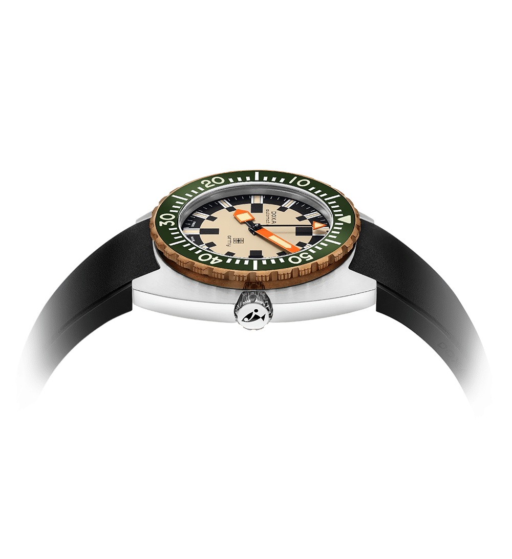 Modellen har en enveis roterende bezel, tilgjengelig i rustfritt stål eller bronse, begge med keramisk innsats i svart eller Army Green. Super-LumiNova® gir optimal lesbarhet under vann, selv under krevende forhold.