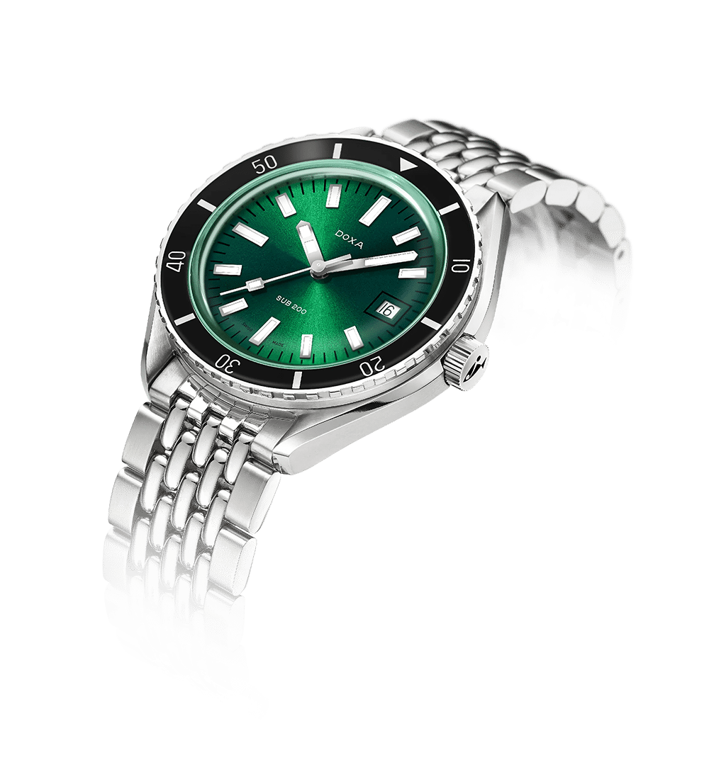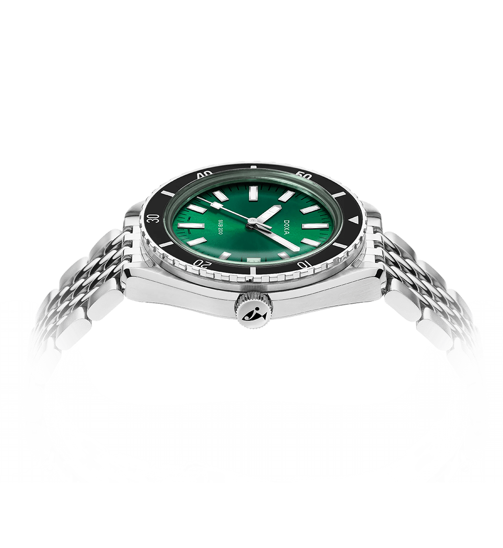 Lansert på Baselworld 2019, er SUB 200 en elegant og kapabel dykkerklokke med tydelige referanser til DOXAs historiske design. Urkassen på 42 mm i 316L rustfritt stål kombineres med et kuppelformet, ripebestandig safirglass med antireflekterende belegg – en moderne hyllest til vintage pleksiglass.
