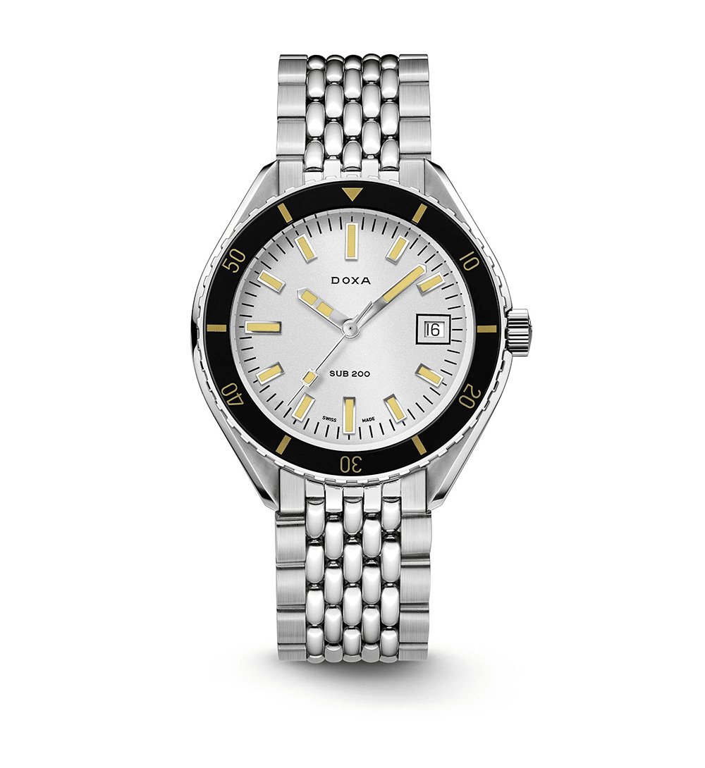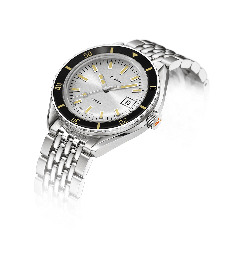 Lansert på Baselworld 2019, er SUB 200 en elegant og kapabel dykkerklokke med tydelige referanser til DOXAs historiske design. Urkassen på 42 mm i 316L rustfritt stål kombineres med et kuppelformet, ripebestandig safirglass med antireflekterende belegg – en moderne hyllest til vintage pleksiglass.
