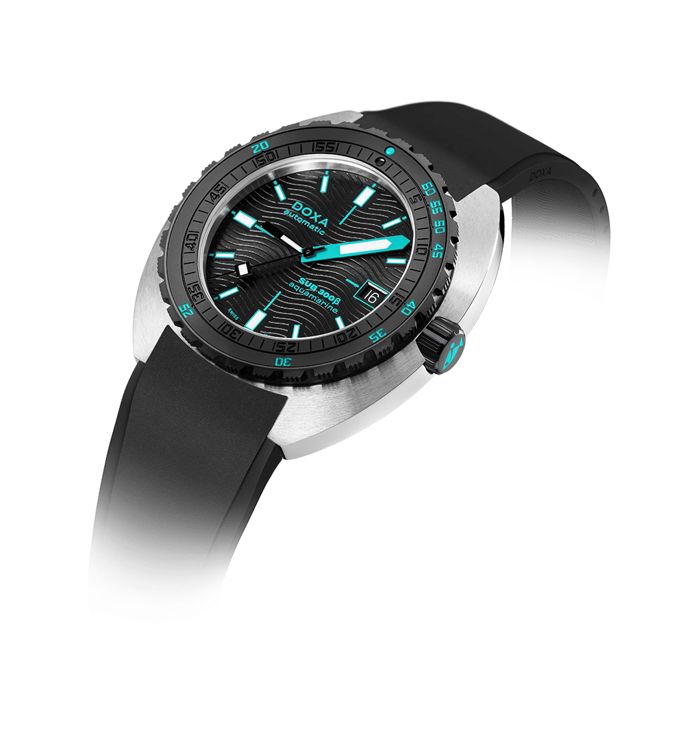 SUB 300β kombinerer DOXAs dykkerarv med moderne, sport-chic design. Urkassen på 42,5 mm er redesignet for et slankere uttrykk med en tykkelse på kun 11,95 mm. Den svarte keramiske bezelen, sunburst-finishen på skiven og skrukrone gir klokken en raffinert, men robust karakter.