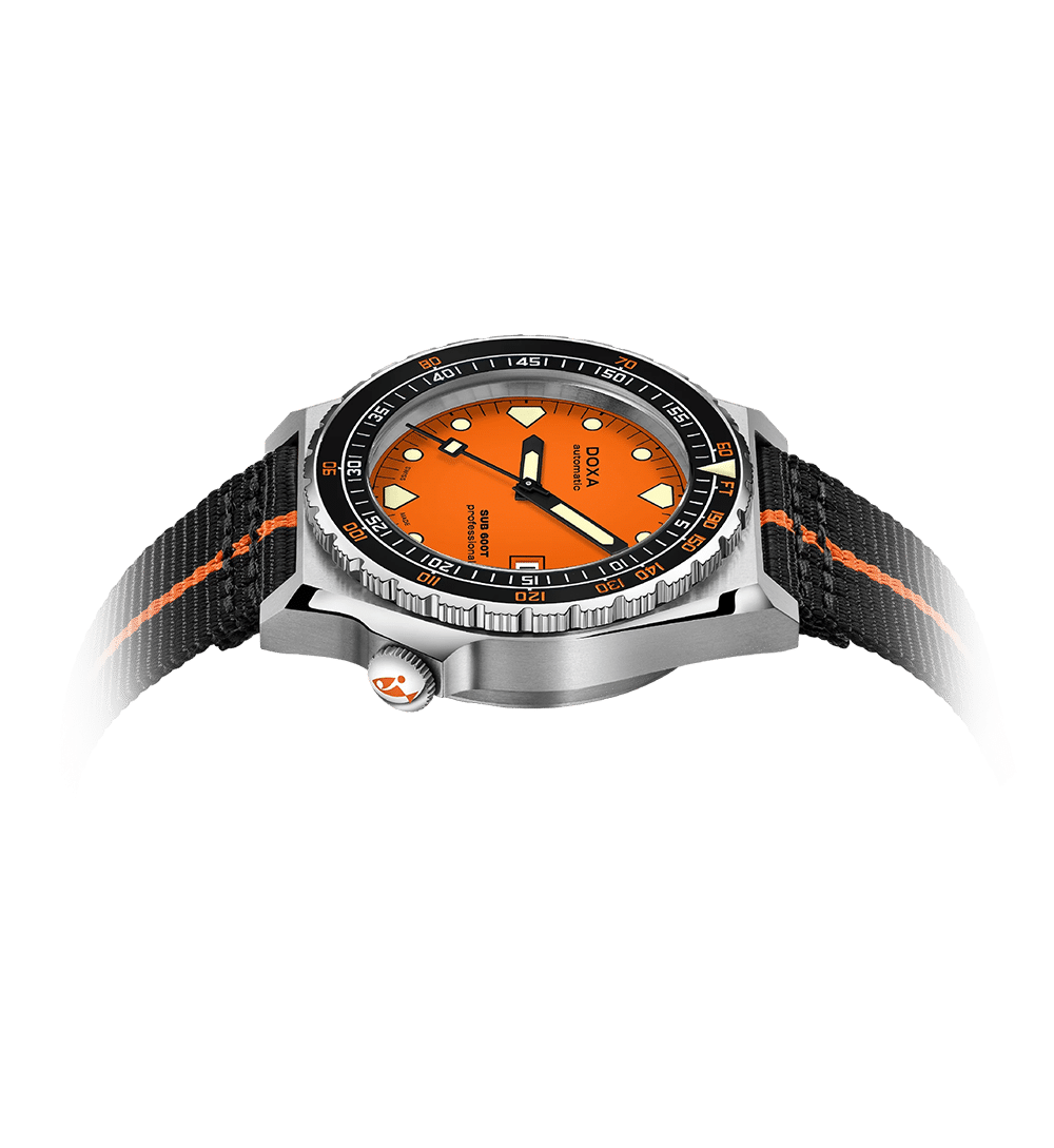 SUB 600T viderefører det kantede 80-tallsdesignet som gjorde modellen legendarisk, nå kombinert med moderne robusthet og funksjonalitet. Med sin spesialformede urkasse fremstår klokken større enn den faktisk er – til tross for at diameteren kun er 40 mm, den minste i DOXA-familien.