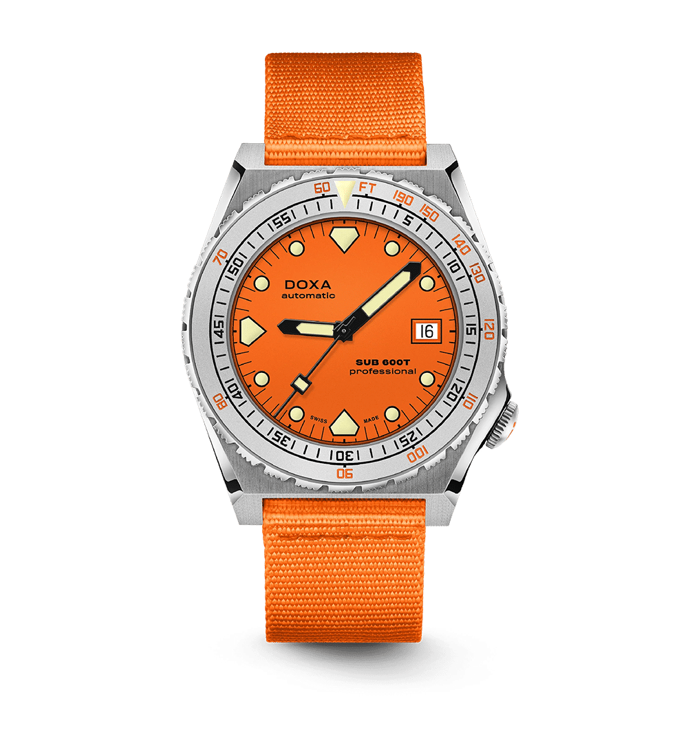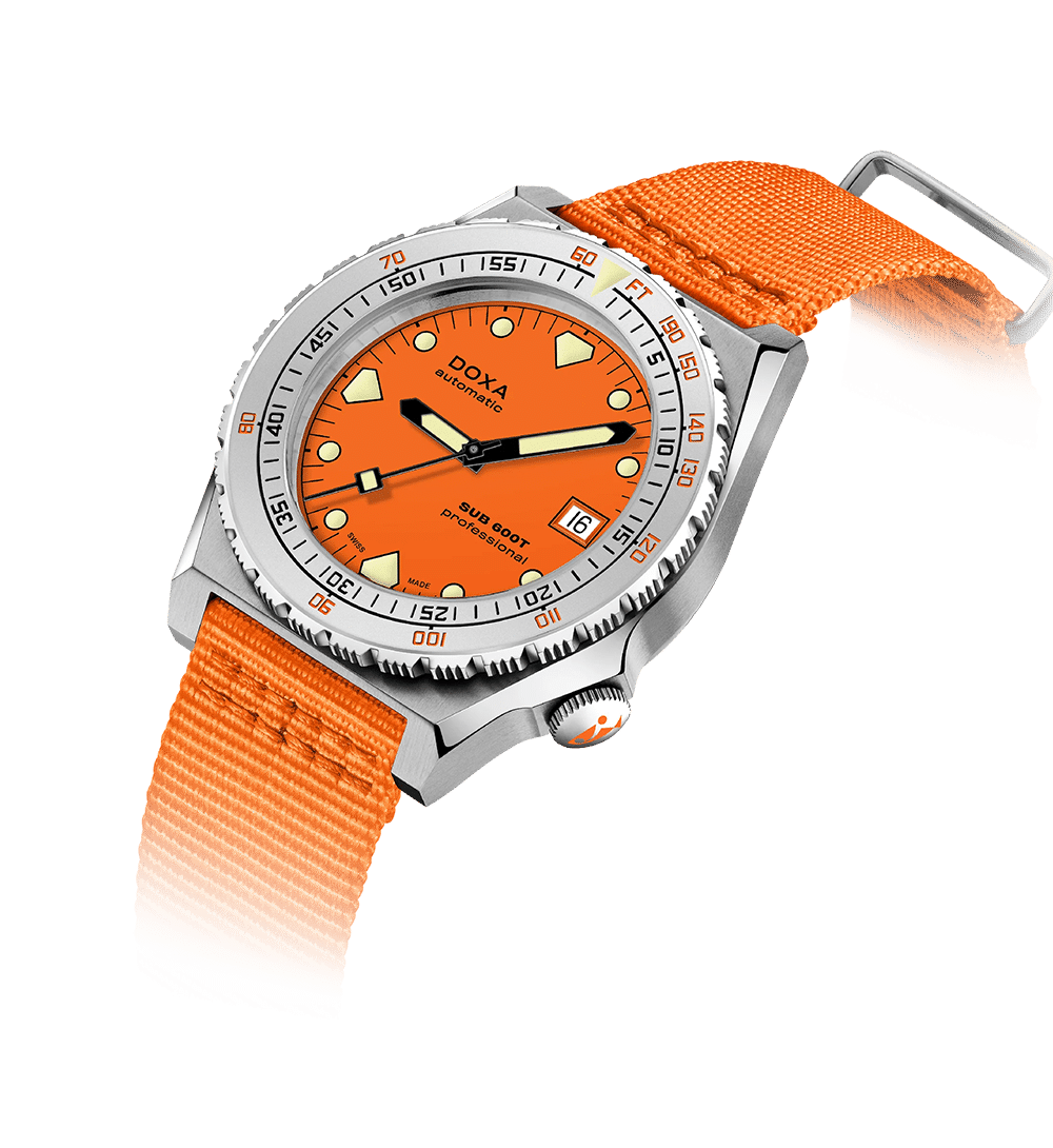 SUB 600T viderefører det kantede 80-tallsdesignet som gjorde modellen legendarisk, nå kombinert med moderne robusthet og funksjonalitet. Med sin spesialformede urkasse fremstår klokken større enn den faktisk er – til tross for at diameteren kun er 40 mm, den minste i DOXA-familien.