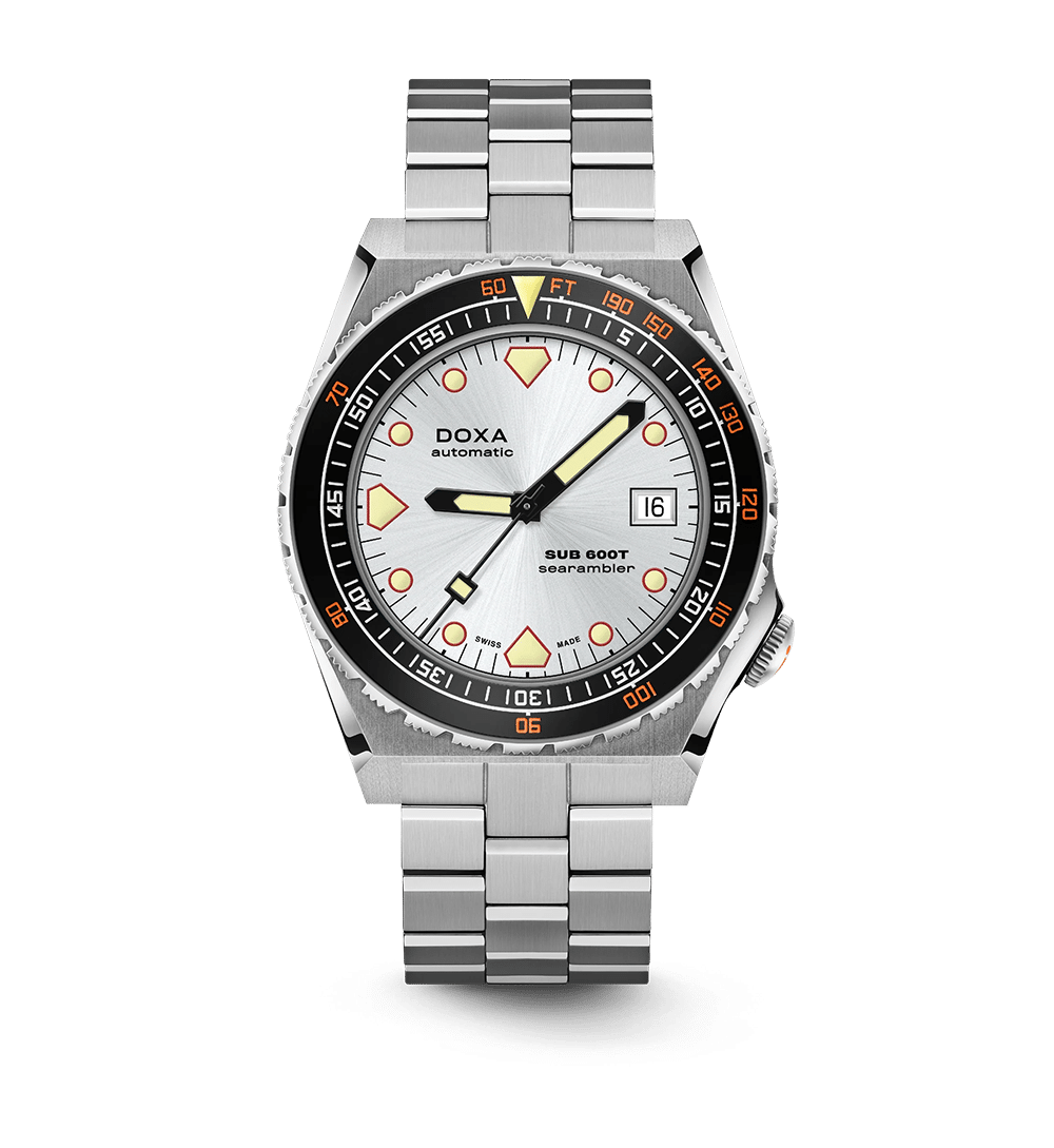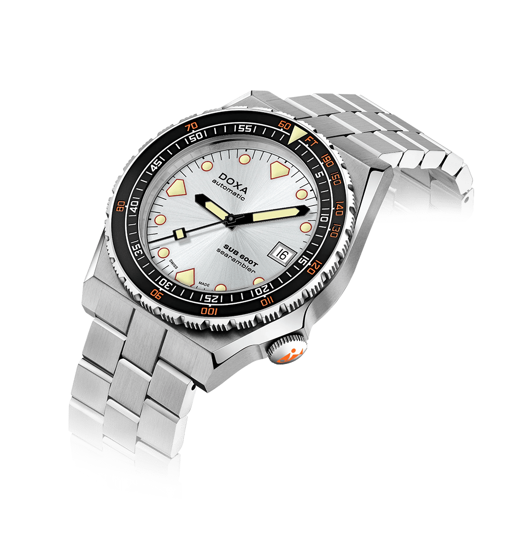 SUB 600T viderefører det kantede 80-tallsdesignet som gjorde modellen legendarisk, nå kombinert med moderne robusthet og funksjonalitet. Med sin spesialformede urkasse fremstår klokken større enn den faktisk er – til tross for at diameteren kun er 40 mm, den minste i DOXA-familien.