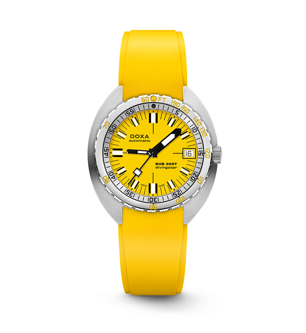 SUB 200T viderefører DOXAs dykkerarv i en slankere og mer raffinert form. Med en diameter på 39 mm og en tykkelse på bare 10,70 mm, tilbyr klokken en elegant profil uten å gå på kompromiss med ytelse. Den finjusterte urskiven gir et moderne uttrykk, mens den kompakte urkassen i 316L rustfritt stål ivaretar klassisk SUB-design.