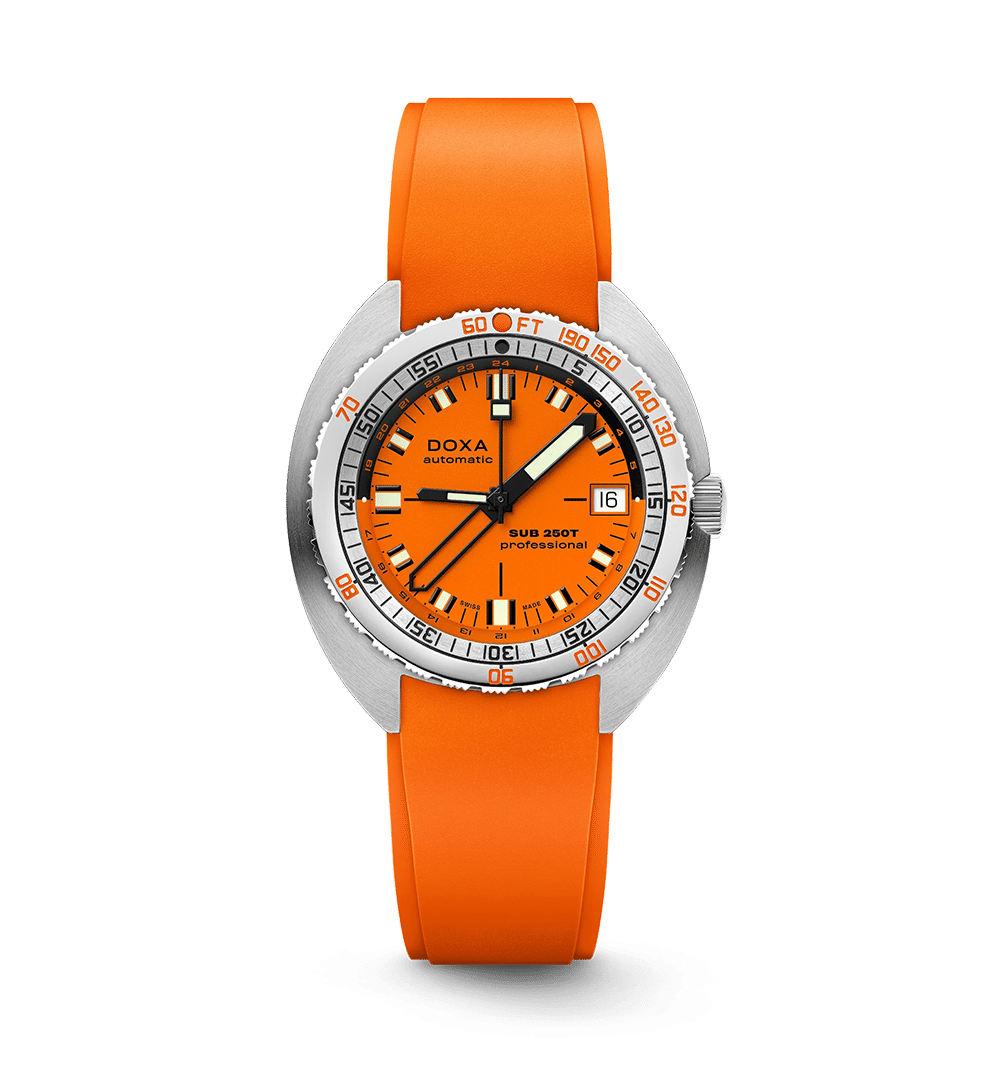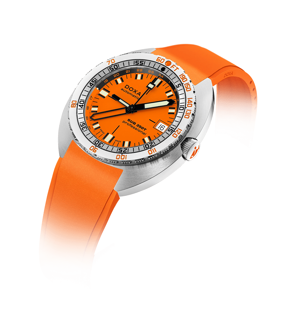 SUB 250T GMT markerer DOXAs tilbakekomst til GMT-funksjonen og forener robust dykkerteknologi med global funksjonalitet. Med en kompakt og komfortabel 40 mm urkasse i 316L rustfritt stål, enveis roterende bezel og skrudd krone, er klokken vanntett til 250 meter – ideell for både dypdykk og reiser.